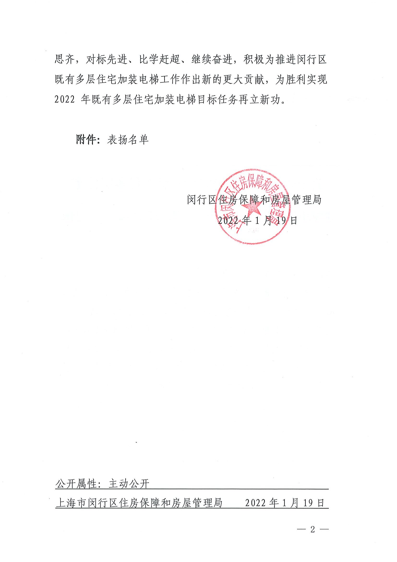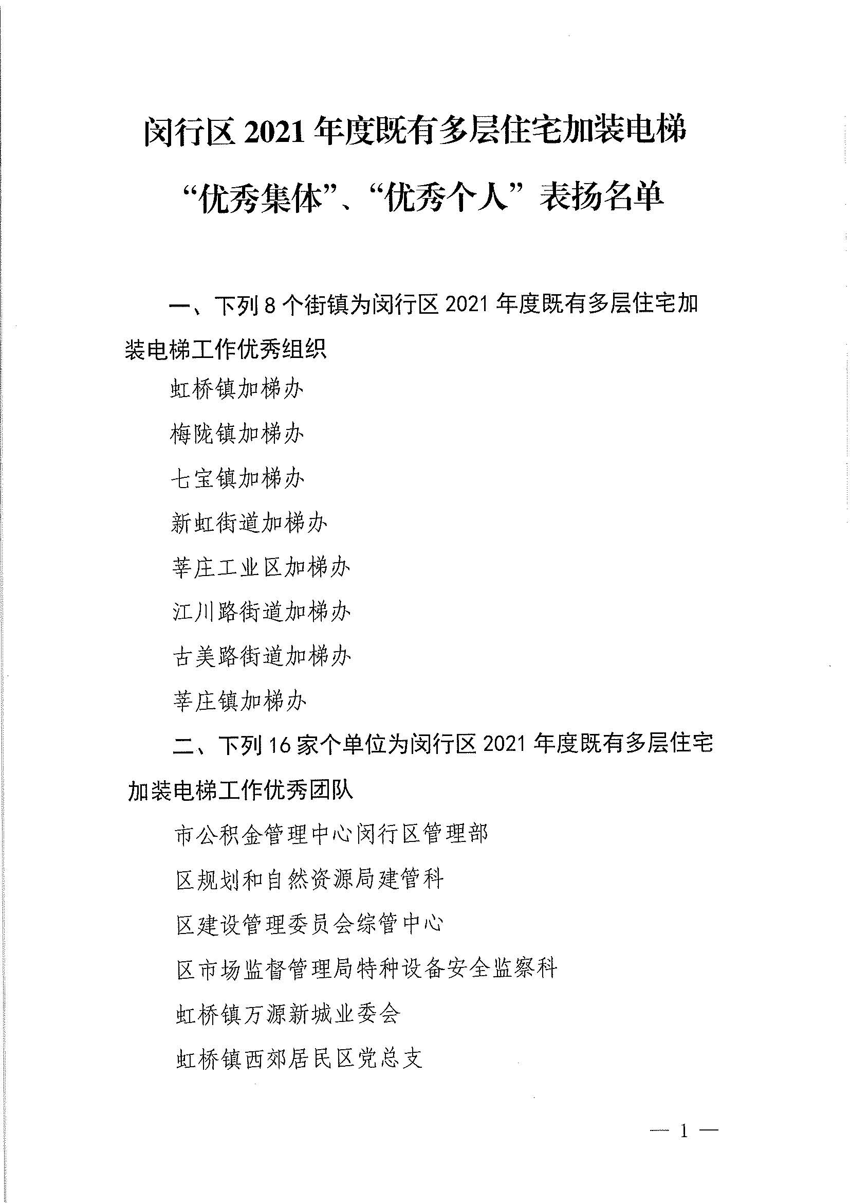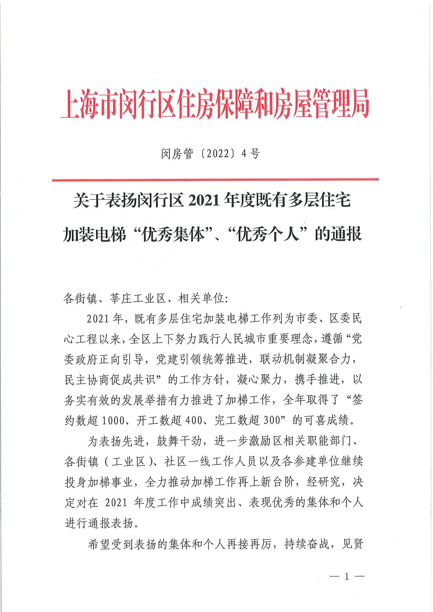 闵房管[2022]4号 关于表扬闵行区2021年度既有多层住宅加装电梯“优秀集体”、“优秀个人”的通报