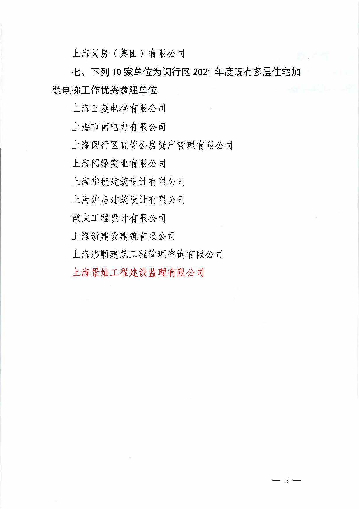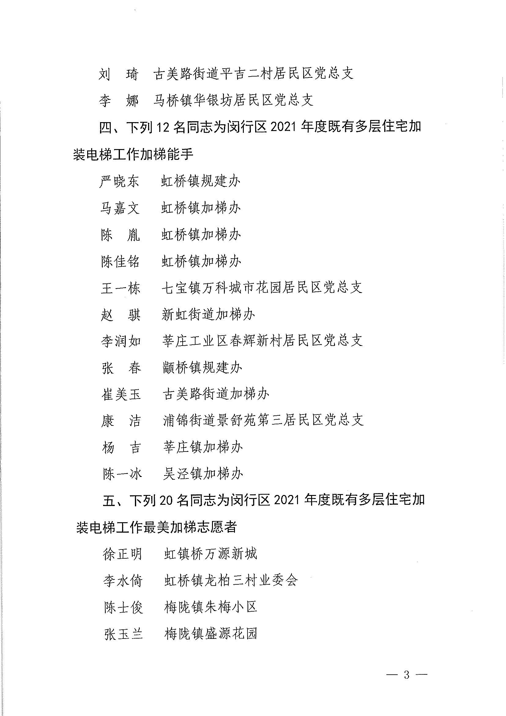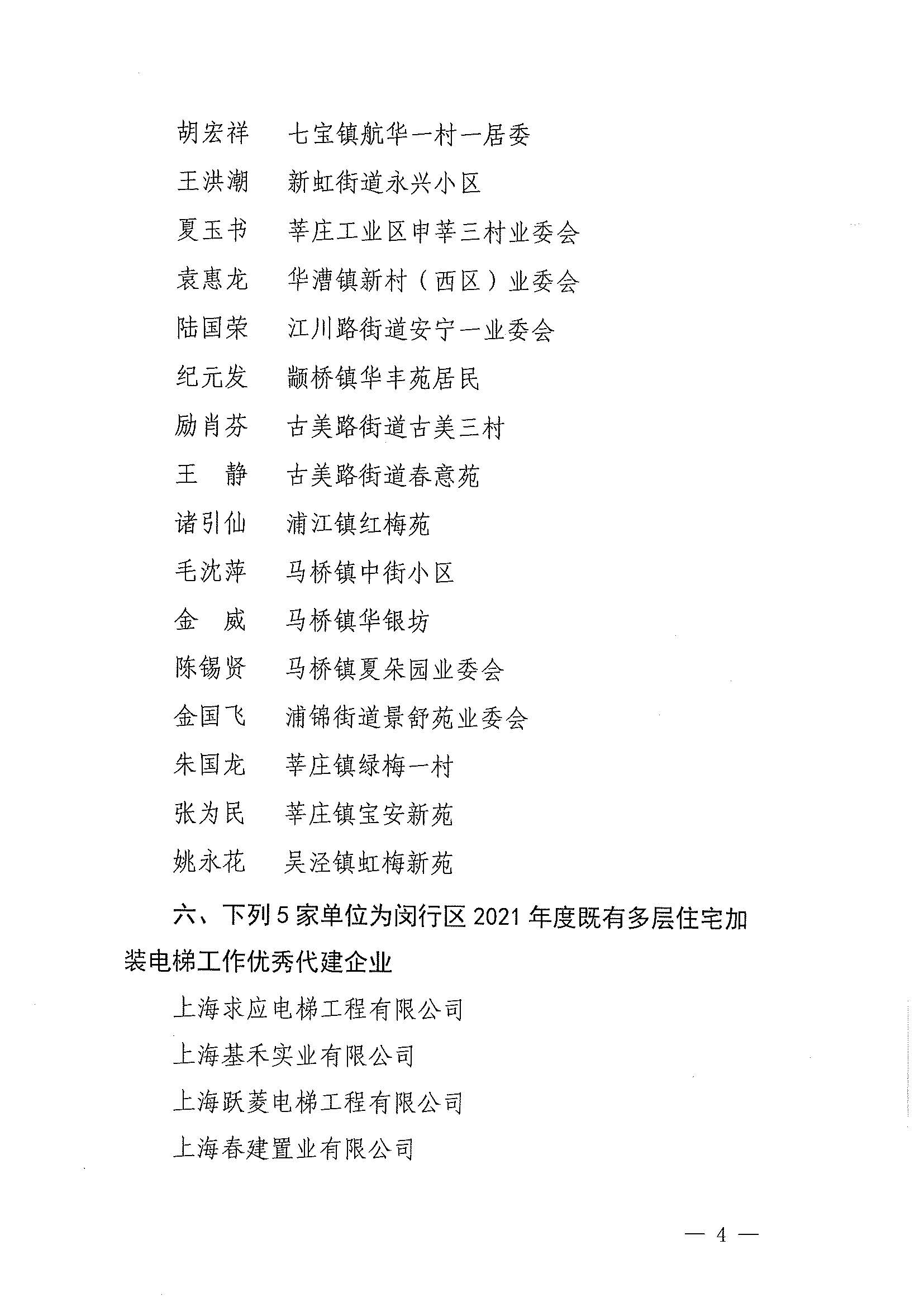 闵房管[2022]4号 关于表扬闵行区2021年度既有多层住宅加装电梯“优秀集体”、“优秀个人”的通报