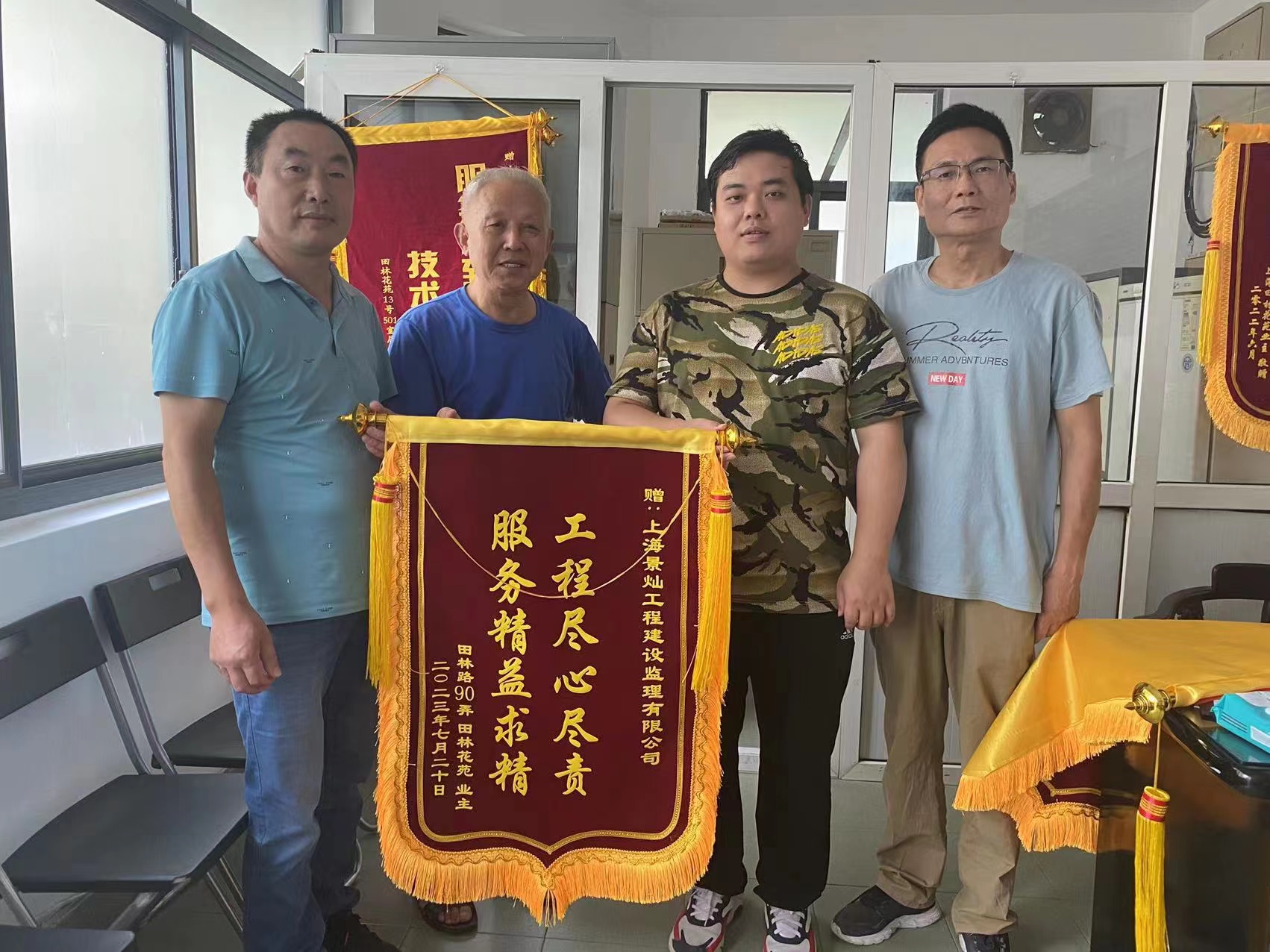 田林路90弄、田林花苑屋面及相关设施改造工程竣工验收会议于2023年8月2日在田林路90弄居委会圆满召开,本次竣工验收取得了政府部门的认可,收到了街道、居委会及业委会对本次竣工验收工作表示好评,并向田林路90弄、田林花苑屋面及相关设施改造工程监理项目部颁发锦旗。