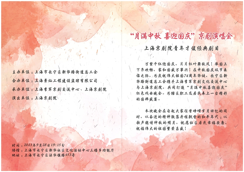 由我司上海景灿工程建设监理有限公司及上海市长宁区新华街道总工会联合合办的“月满中秋 喜迎国庆”京剧演唱会,于2023年9月28日晚上19:15分 在上海市长宁区新华社区文化活动中心三楼多功能厅举行演出, 我司作为本次演出的合办单位由公司副总沈钰奇同志作为公司代表嘉宾出席本次活动.