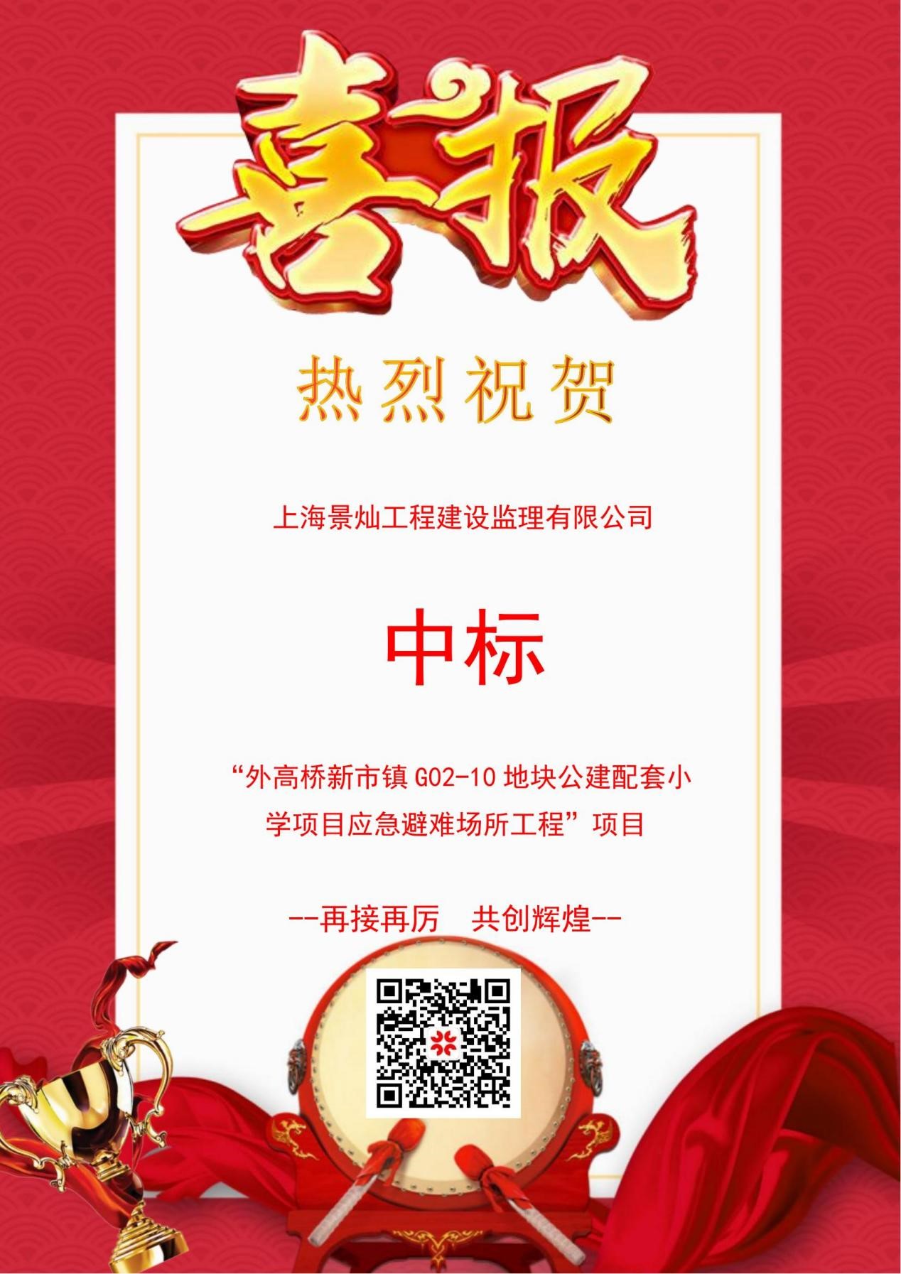 喜报! 恭喜上海景灿工程建设监理有限公司中标“外高桥新市镇G02-10地块公建配套小学项目应急避难场所工程”项目
