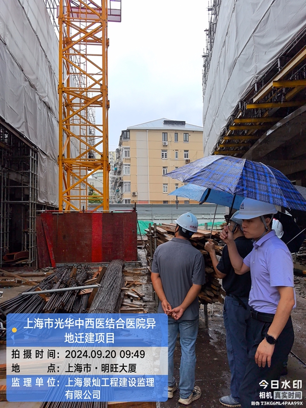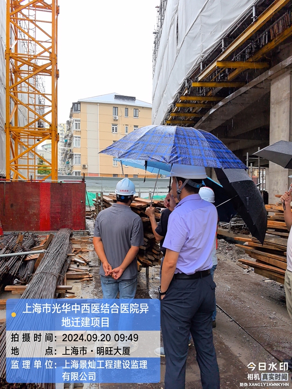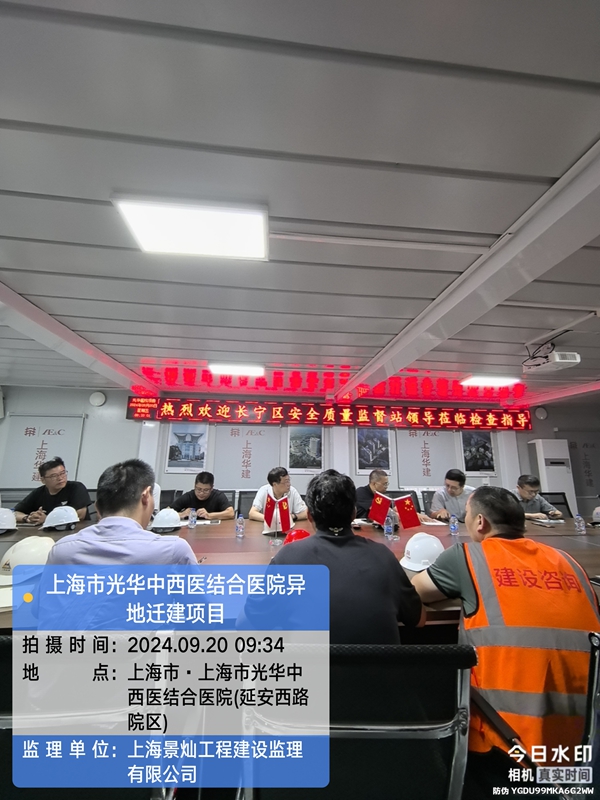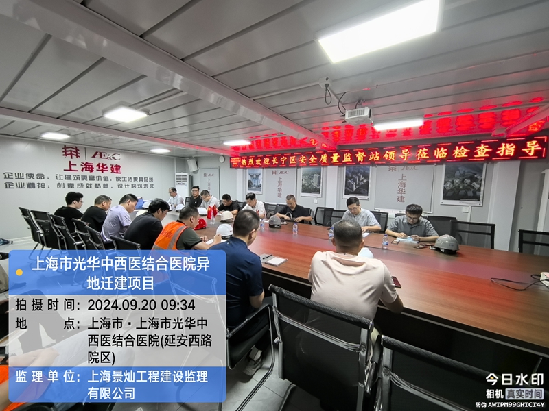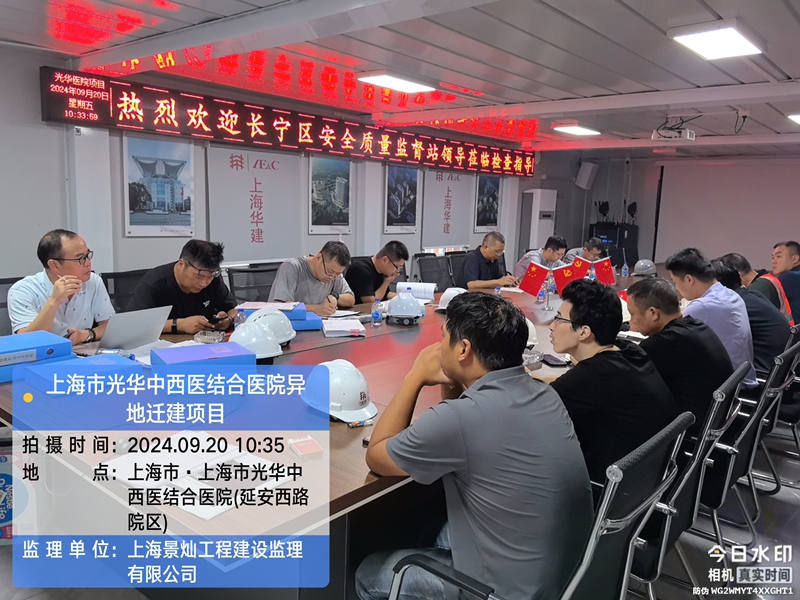 2024年9月20日上午9点30分,安全监督站领导及第三方机构至上海市光华中西医结合医院异地迁建项目现场指导工作,首先对光华医院项目目前的进度情况进行了解,随后同各参建方至施工现场检查建筑施工起重机械、模板支撑体系和脚手架工程专项检查工作,返回现场办公区后在现场会议室召开会议,由长宁区建设工程质量安全监督站领导及第三方检查机构对施工现场发现存在安全生产隐患事宜进行指导工作,对光华医院项目就安全、质量、进度进行重要讲话,要求在确保质量及安全第一的前提下,有序的推进光华医院项目的总体目标。