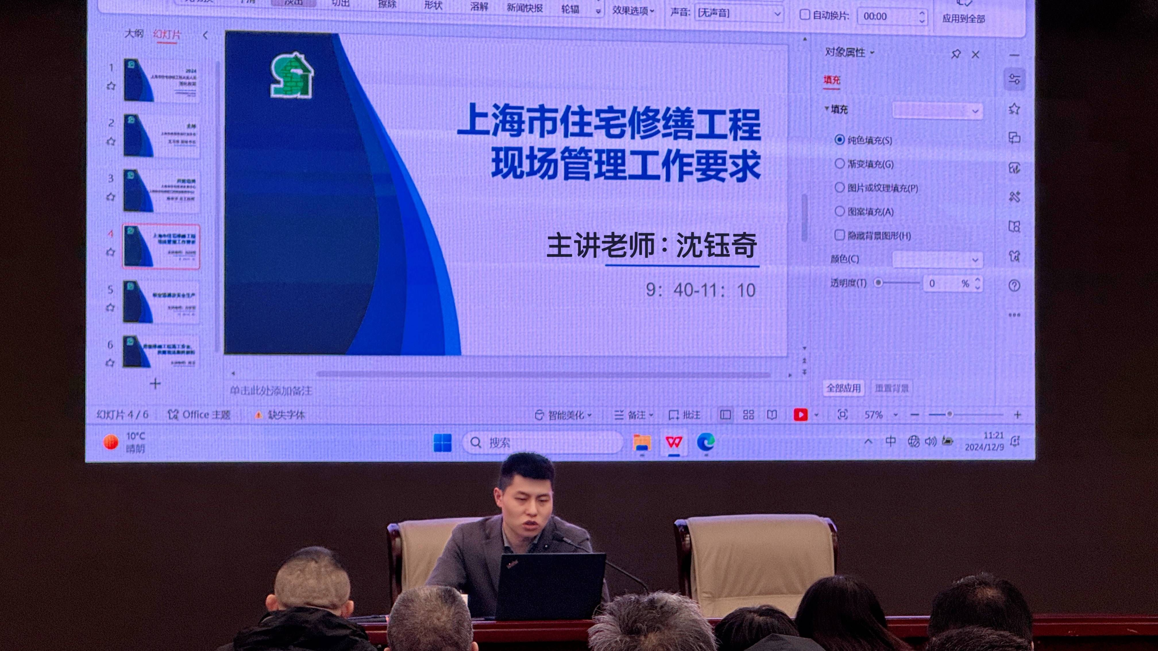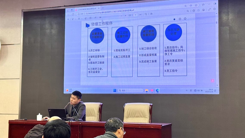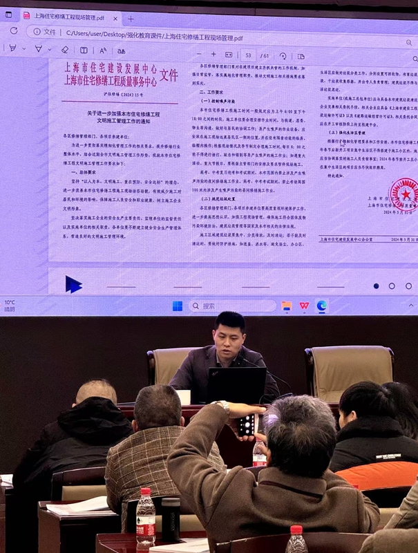 2024年12月09日上海市房屋修建行业协会邀请我司工程部副总沈钰奇同志为“2024年上海市住宅修缮工程从业人员强化教育培训”授课讲师,沈钰奇同志就“上海市住宅修缮工程现场管理工作要求”做专业授课指导。